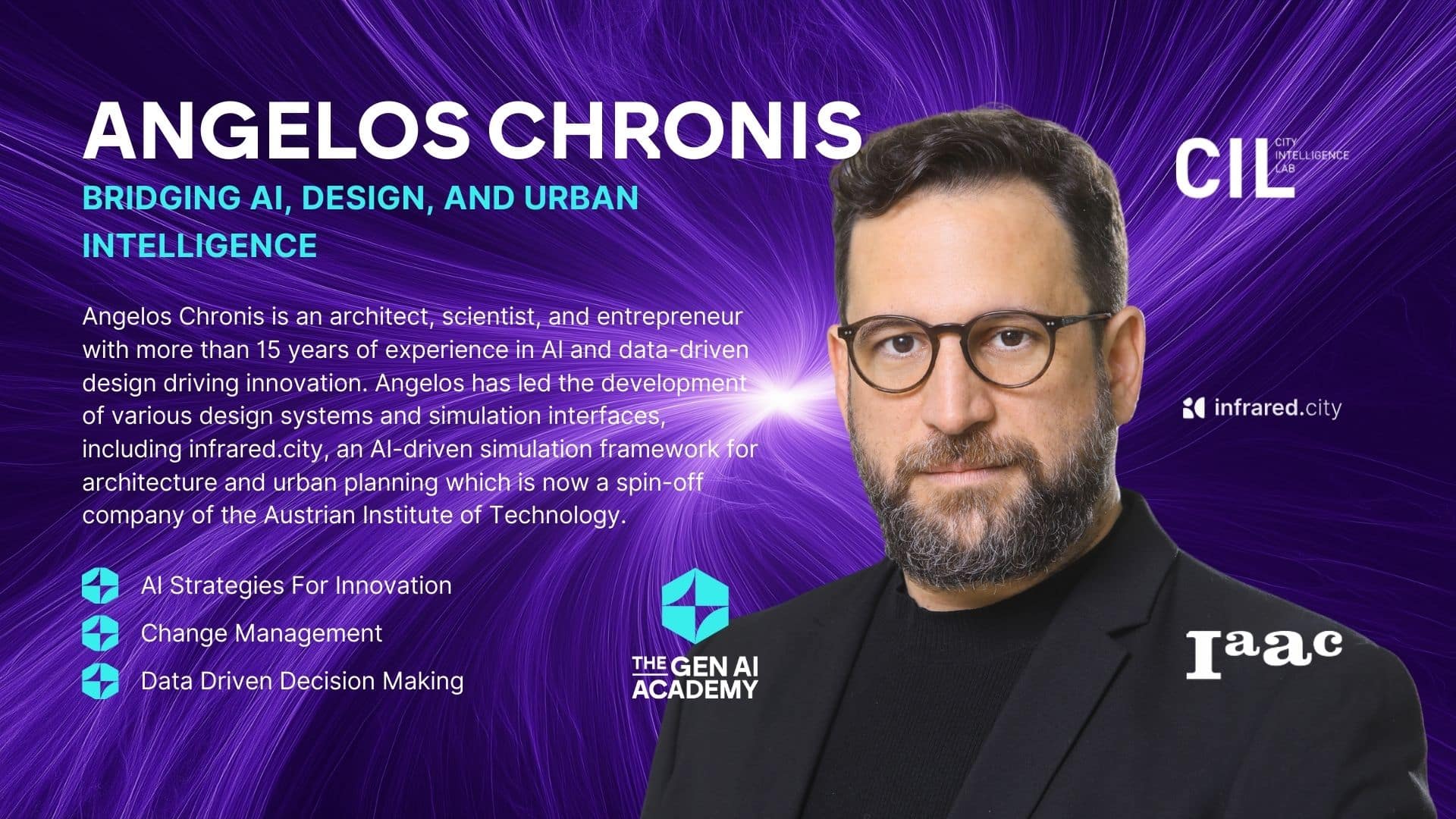 Angelos è amministratore delegato e cofondatore di Infrared City GmbH, condirettore del Master in Intelligenza artificiale per l'architettura e l'ambiente costruito presso l'Istituto di architettura avanzata della Catalogna, nonché ingegnere ricercatore senior e consulente strategico del City Intelligence Lab dell'Istituto austriaco di tecnologia.