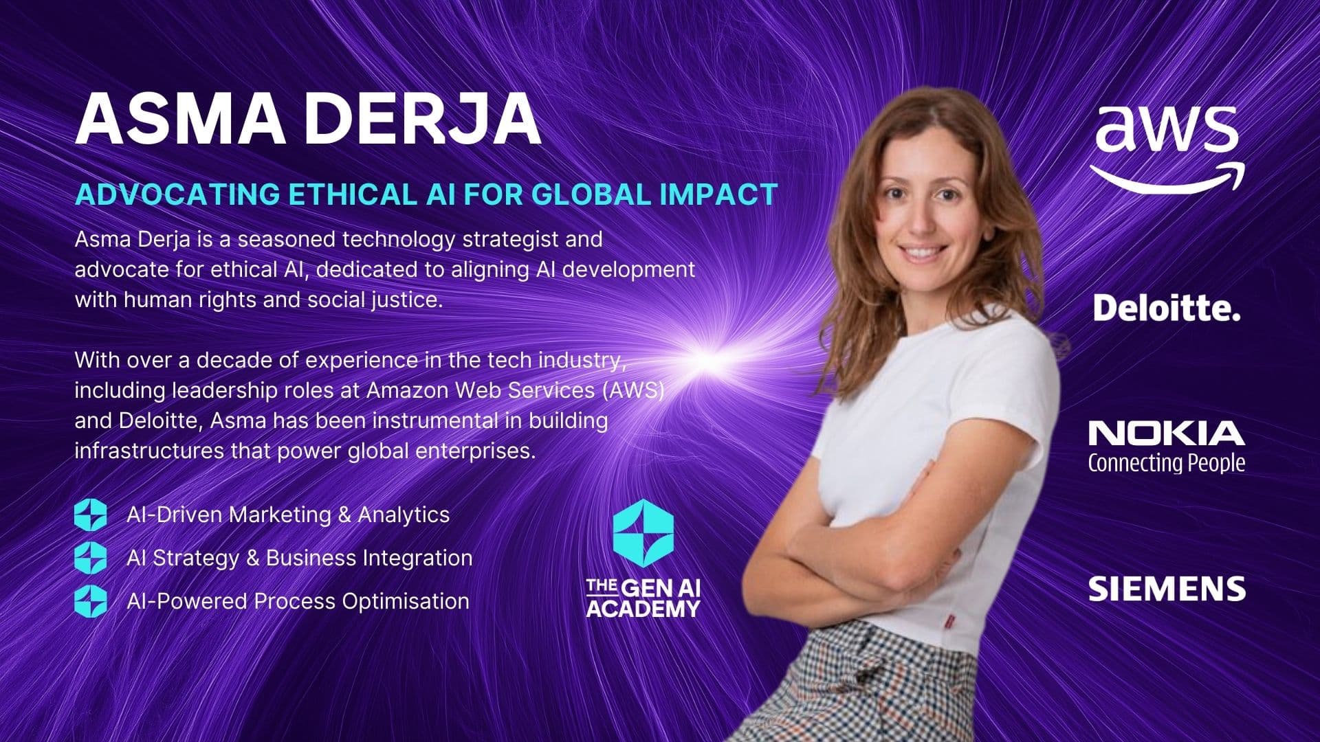 Asma Derja è leader mondiale nella strategia e nella governance dell'intelligenza artificiale, nota per aver saputo coniugare la trasformazione aziendale con la tecnologia etica. Con oltre 15 anni di esperienza nella gestione di progetti multimilionari in quattro continenti, ha guidato la trasformazione digitale e operativa per clienti Fortune 500 presso AWS e Deloitte, apportando una rara combinazione di intuizione strategica, rigore operativo ed eccellenza nell'esecuzione.