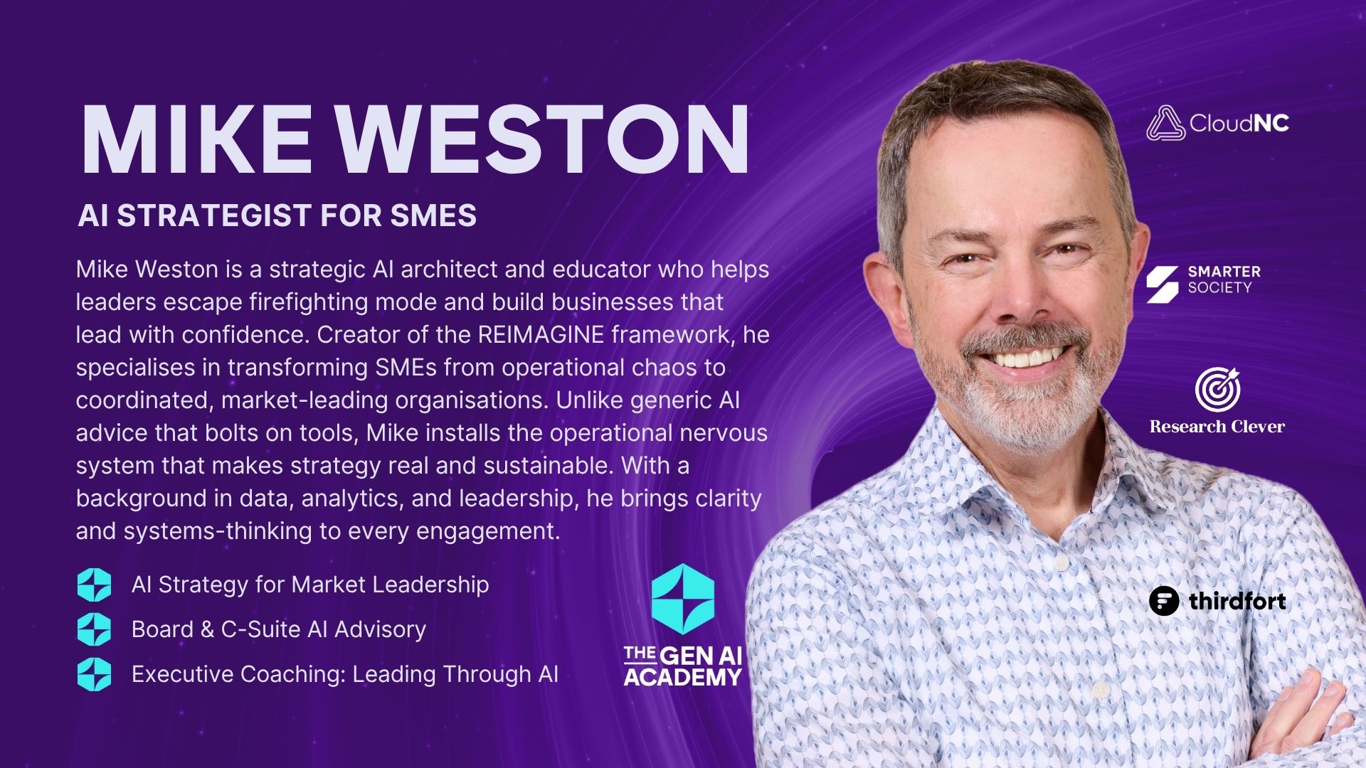 È l'ideatore del framework REIMAGINE, progettato specificamente per le piccole e medie imprese (PMI). Troppo spesso le aziende vengono superate non perché i loro prodotti sono inferiori, ma perché le loro operazioni mancano del coordinamento e dei sistemi che i concorrenti hanno saputo padroneggiare. Mike ha sviluppato REIMAGINE per cambiare questa situazione, installando il sistema nervoso operativo che consente alla strategia di realizzarsi, invece di perdersi nel caos quotidiano.