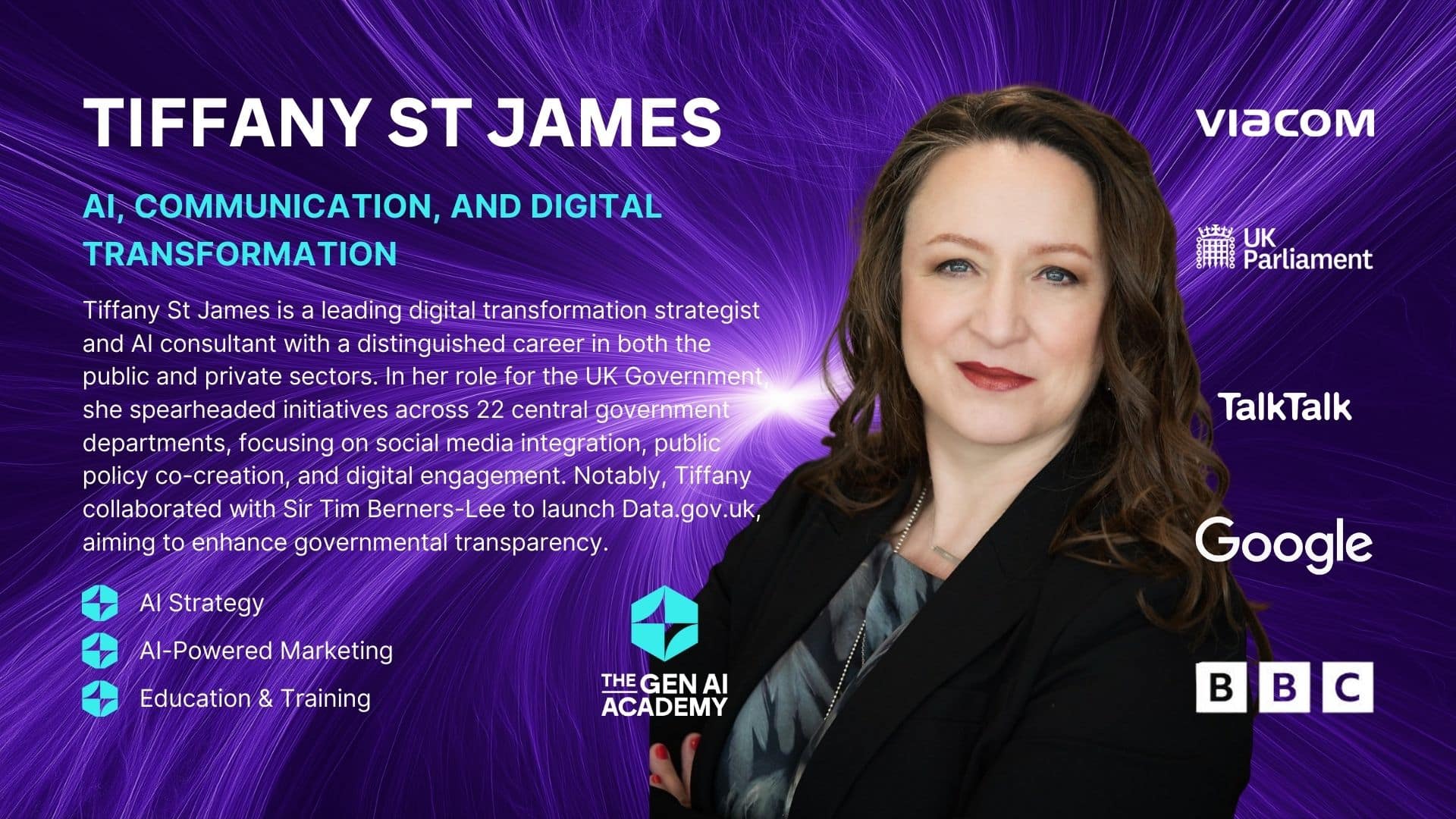 Tiffany St James è una stratega leader nella trasformazione digitale, psicologa della leadership e consulente di intelligenza artificiale con una brillante carriera sia nel settore pubblico che in quello privato. In qualità di ex responsabile della partecipazione pubblica per il governo britannico, ha guidato iniziative in 22 dipartimenti del governo centrale, come responsabile strategica pan-governativa per i social media, gli open data, la co-creazione di politiche pubbliche e la politica digitale. In particolare, Tiffany ha collaborato con Sir Tim Berners-Lee al lancio di Data.gov.uk, contribuendo a rendere il governo britannico il più trasparente al mondo durante il suo mandato.