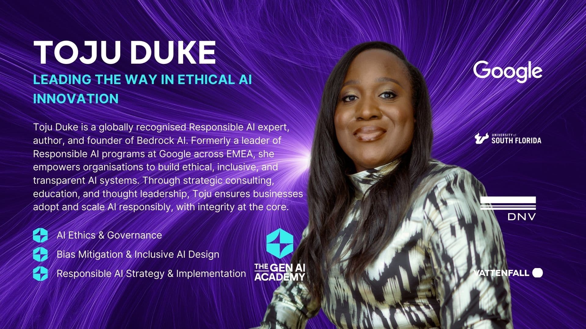 Riconosciuta come una delle donne più influenti nel campo dell'intelligenza artificiale, Toju è una popolare relatrice, autrice, opinion leader, consulente e imprenditrice con oltre 20 anni di esperienza nei settori della pubblicità, della vendita al dettaglio, del no profit e della tecnologia. Toju ha lavorato per 10 anni presso Google, dove negli ultimi due anni ha ricoperto il ruolo di Programme Manager on Responsible AI, guidando vari programmi di IA responsabile nei team di prodotto e ricerca di Google, con particolare attenzione ai modelli su larga scala e ai processi di IA responsabile. Prima di entrare a far parte dell'organizzazione di ricerca di Google, Toju è stata responsabile di prodotto EMEA per Google Travel e ha lavorato come specialista per Google Travel e Shopping.